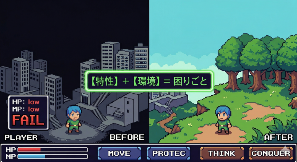 「特性」+「環境」=困りごと