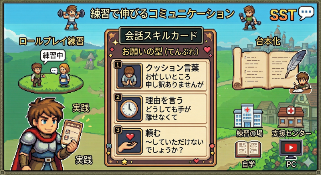 コミュニケーションは才能だけじゃなく、練習で伸びます。 ASDの人にとって特に相性がいいのが SST(ソーシャルスキルトレーニング) です。