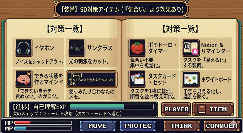 ここからが本題です。 ASDを”ステータス”として捉えたら、やることはシンプル。 自分の強みを活かせるように、装備と戦略を整える だけ。