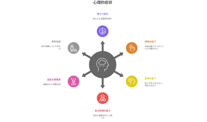 うつ病の症状は人によって異なりますが、次のような特徴が続くのが一般的です。