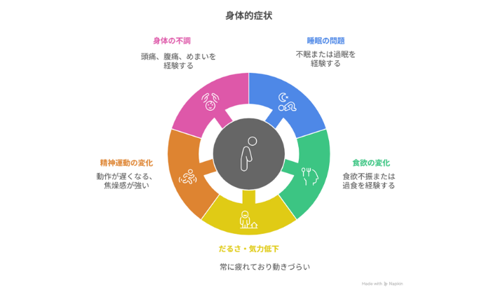 環境要因:過重労働、役割変化(昇進・異動・育児・介護)、生活リズムの乱れ など
