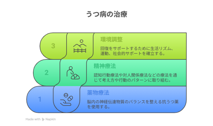 適度な運動:運動はうつ病の治療に効果があると言われています。ウォーキングなど無理なく続けられるものから始めることが多いです。