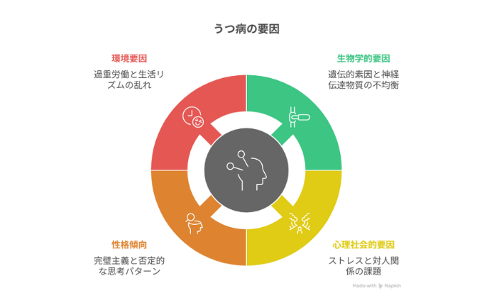 生物学的要因:遺伝的素因、神経伝達物質の不均衡、ホルモン変化 など