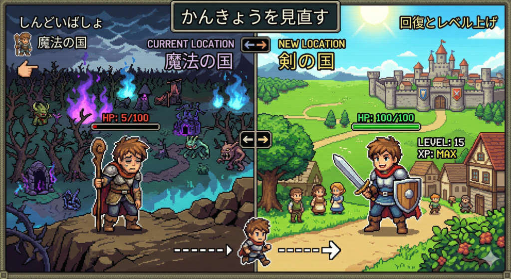 環境を変えるのは逃げじゃなく、戦略です。 HPが削れる場所で粘り続けるより、 回復できる場所でレベル上げしたほうが強くなれます。